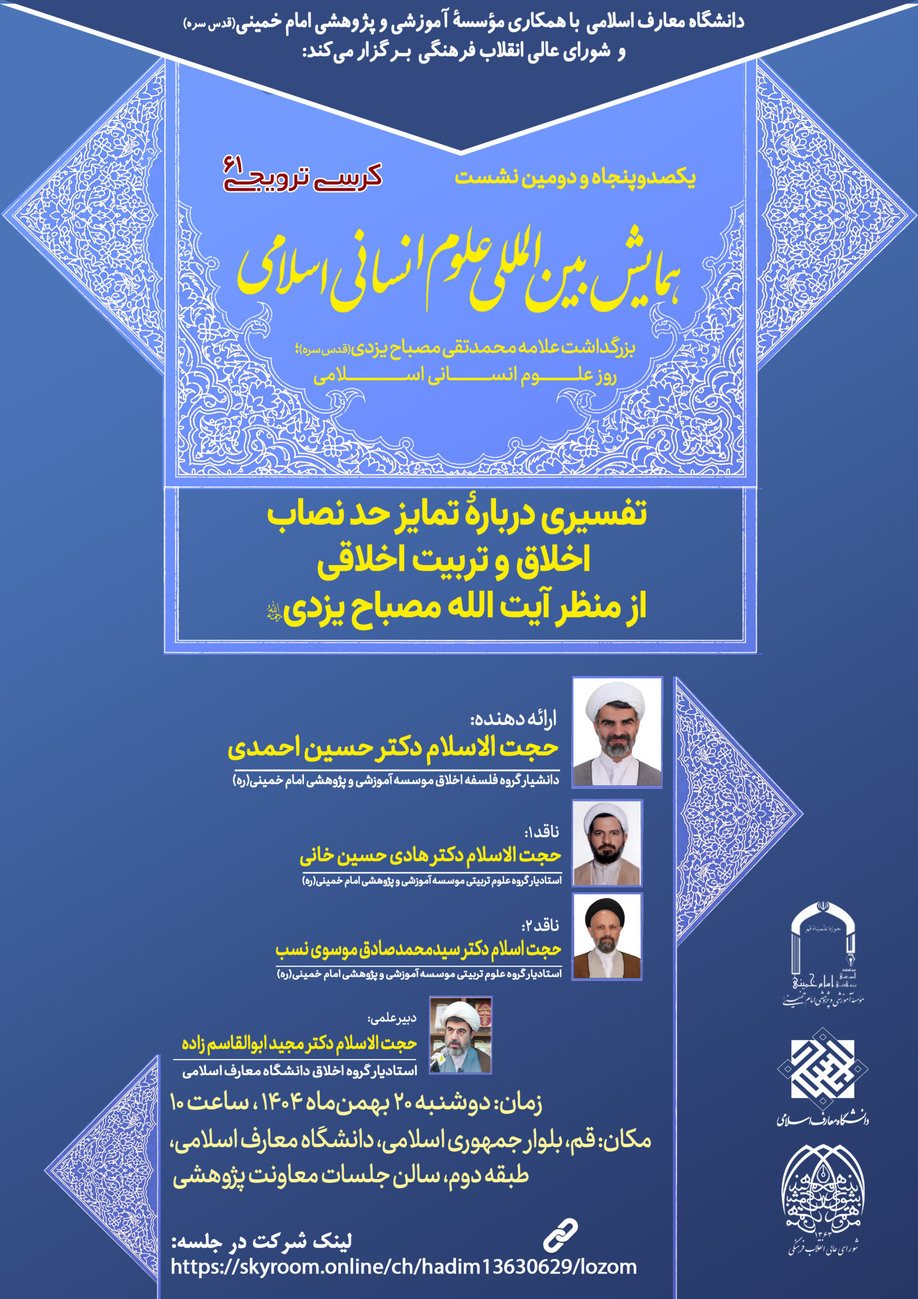 کرسی ترویجی با عنوان «تفسیری دربارۀ تمایز حد نصاب اخلاق و تربیت اخلاقی از منظر آیت الله مصباح یزدی(ره)» به همت معاونت پژوهشی دانشگاه معارف اسلامی ، همکاری مؤسسه آموزشی و پژوهشی امام خمینی (ره)و شورای انقلاب عالی انقلاب فرهنگی برگزار می گردد.