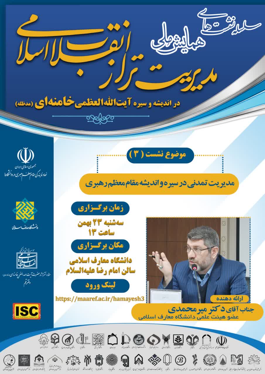 سومین پیش‌نشست  همایش ملی “مدیریت تراز انقلاب اسلامی در اندیشه و سیره آیت‌الله العظمی خامنه‌ای” به صورت مجازی سه شنبه ۲۳ بهمن ۱۴۰۳ ساعت ۱۳ با ارائه جناب آقای دکتر سید ضیاءالدین میرمحمدی (عضو هیئت علمی دانشگاه معارف اسلامی) برگزار خواهد شد.